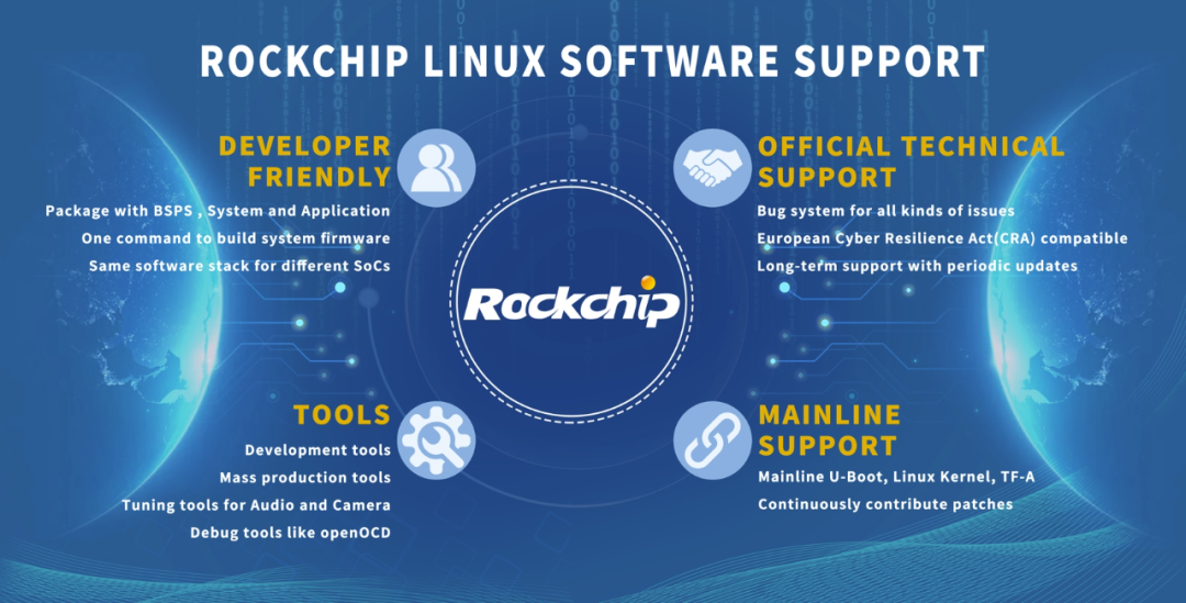 RockChip-ek softwarearen ziurtagiriaren laguntza eskaintzen du eta Mainstream Chip plataformak Linux eta Android sistemaren azken bertsioetara eguneratzen eta egokitzen jarraitzen du, BSP, sistema eta aplikazio integratuak garatzaile globaletarako software pakete integratuak eskaintzen ditu. Hainbat arlotan bazkideek eta garatzaileek laguntza teknikoa lor dezakete Rockchip plataforma ofizialean arazo eta arazketa tresna mota guztietarako. Segurtasun-laguntzari dagokionez, RockChip-ek segurtasun mekanismo integralak eskaintzen ditu, esate baterako, lotura osoko abiarazte segurua, fidagarria, zifratzea eta deszifratzeko motorra, firmwarearen osotasuna suposatu ez dadin.